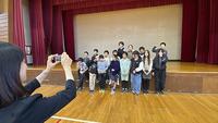 校長先生からは、前期の頑張りを称えられるとともに、後期に向けて「あいさつがもっとできると、さらに素敵な学校生活を送れます」という激励がありました。児童代表の作文では、前期の出来事やこれから頑張りたいことが発表され、全校児童から大きな拍手が送られました。校歌斉唱では、リテイクの練習の成果もあり、みんな大きな声で歌うことができました。退場後、6年生で前期終了の記念撮影もありました。