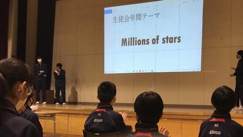 生徒会の年間テーマの発表の様子と部活動紹介ムービーの様子です。