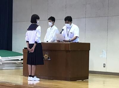 中体連管内大会の結果報告や賞状授与、生徒会役員による感動のフォトムービー、