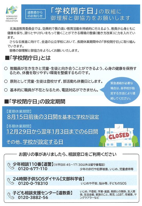 【道教委】冬季休業期間における「学校閉庁日」の設定について