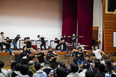 リコーダーや和太鼓等の演奏を通して、音楽で気持ちを伝えることの大切さを表現しました。美しい音色が体育館いっぱいに響き渡りました。