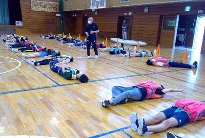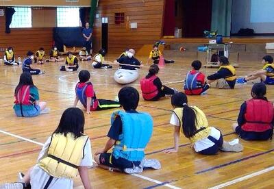 第1回はすべての学年が体育館で川での救助やライフジャケット装着体験を行います。