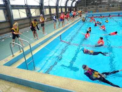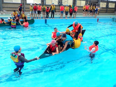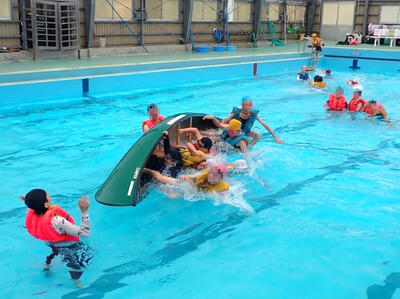 第2回は3年生以上でプールを使ってライフジャケットの浮力を確かめたり、カヌーに乗船し転覆した時の対処について学んだりします。