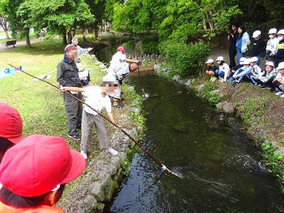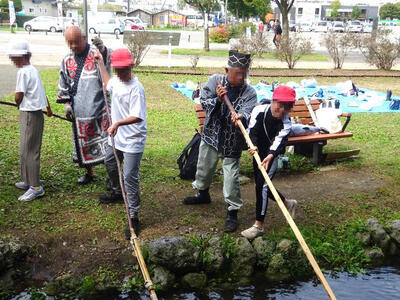 5年生では、千歳アイヌ協会、アイヌ文化財団、千歳水族館の皆様のご協力により、マレクというアイヌ伝統のモリを使ってサケを捕まえる体験を行っています。