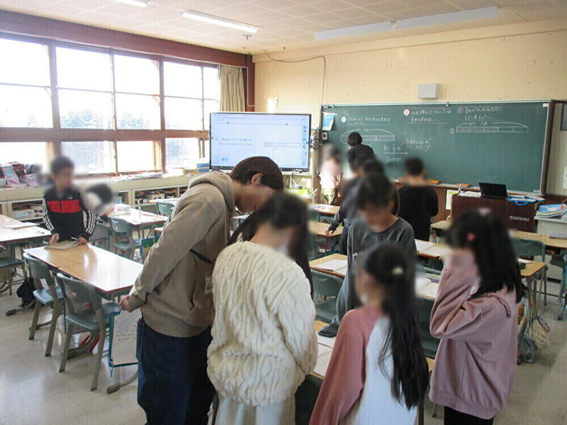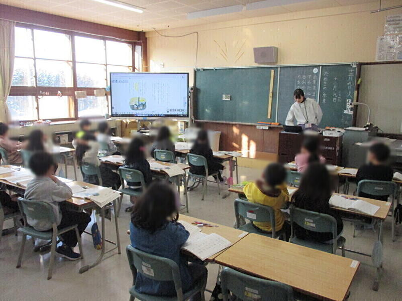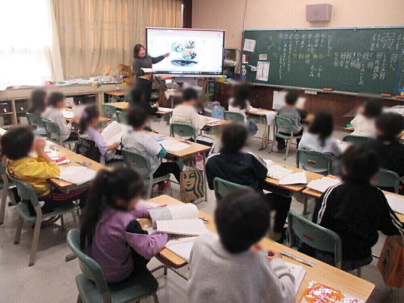 2年生も、国語の学習をしていました。新出漢字の学習の後、「せかい一の話」というお話の読み聞かせを聞いて、おもしろかったことや感じたことを交流していました。読み聞かせの前段には、津軽の位置や八甲田山の様子をなどを確認していました。