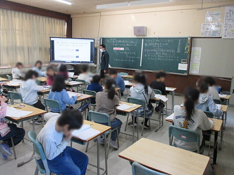 外国語を学習していた学級では、今日はこれまでの学習の評価(テスト)の時間で、小学校と中学校のテストの違いについて説明を受けてから、今日の学習を進めていました。