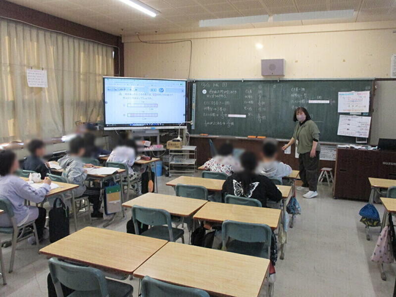 4年生は、算数の学習をしていました。分数のたし算やひき算の学習の最後の時間のようで、教科書の問題や、プリントの問題にどんどん挑戦していました。計算の結果、答えが「二分の四」など、整数になる問題で、気がつかずに分数のまま表記しており、友だちとのチェックで間違いに気づく子もいました。しっかりマスターしたいところです。