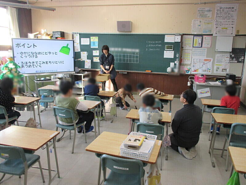 コスモス学級の1時間目は、自立活動の学習でした。今日は、掃除の仕方について学習しており、ちりとりやほうきの使い方について学習していました。みんな上手にちりとりにゴミを集めていました。