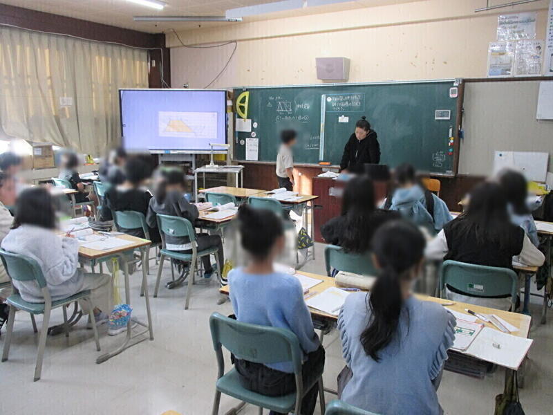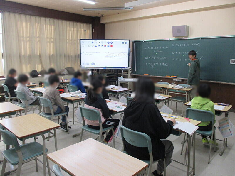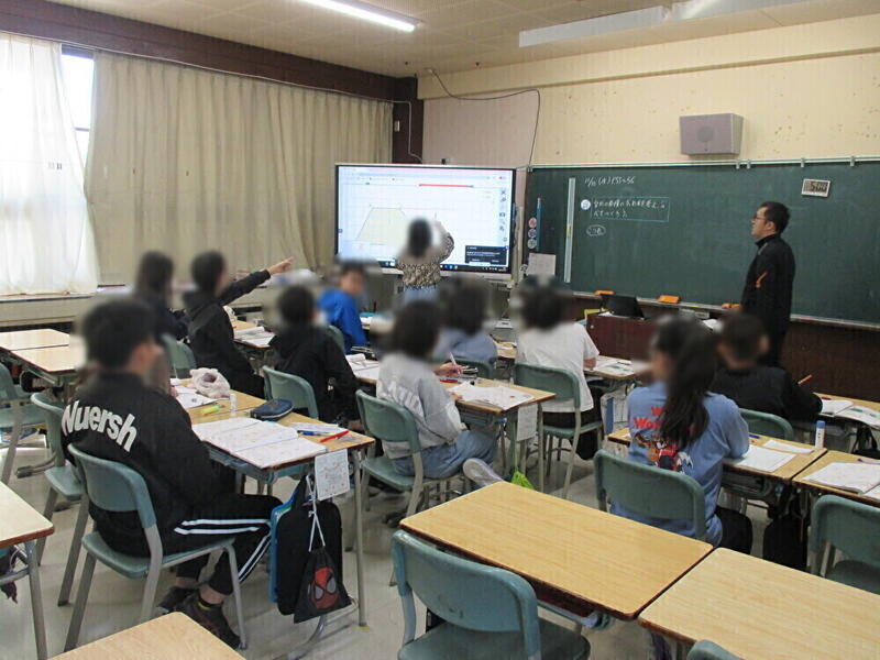 2時間目の5年生は、算数の学習をしていました。図形の学習で、台形の面積の求め方について、いろいろな方法で考えていました。既習事項の平行四辺形の面積を使って面積を求める方法や、面積を分けたり、切って並べ直して面積の公式を知っている形に直したりする方法を次々に発表し、台形の面積を求めていました。