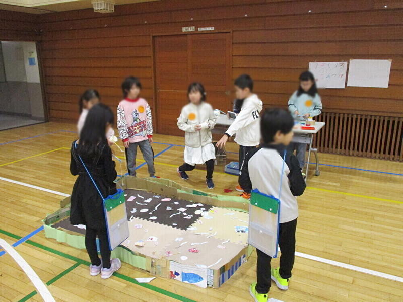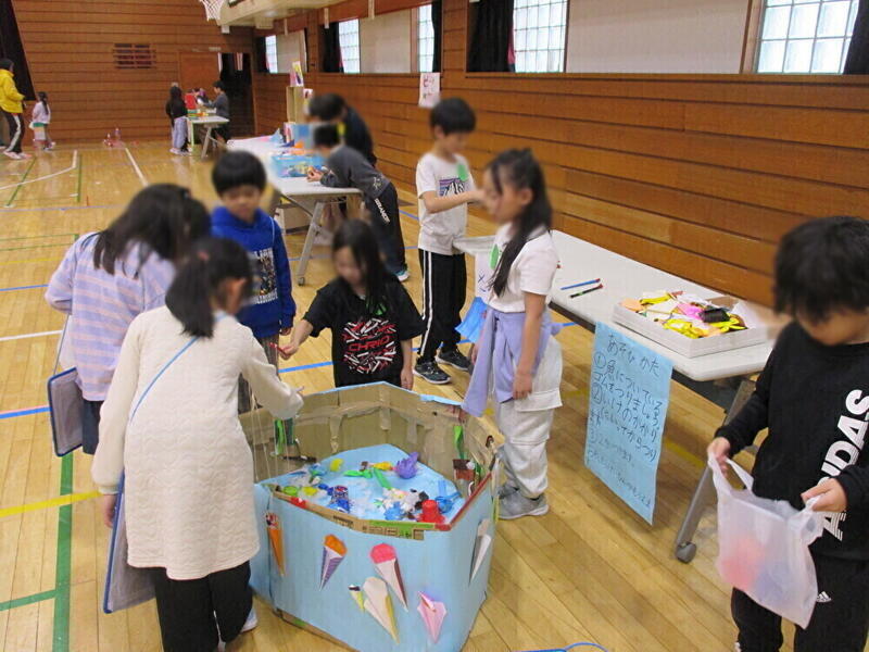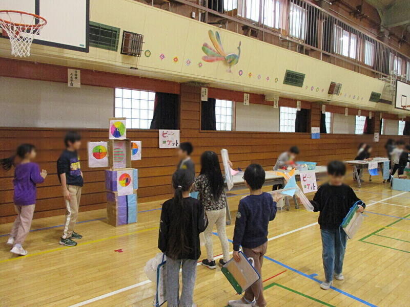 今日は、3、4時間目の1、2年生の生活科の様子をお伝えします。今日は、2年生が1年生に楽しんでもらうためのお店の準備をした「フェスティバル」でした。これまで2年生はお店の計画を立て、先週は2年生だけでお店を出し合って確認し、1年生に楽しんでもらう準備を進めていました。今日は、1年生を招待しお店を楽しんでもらい、フェスティバルは成功したようでした。