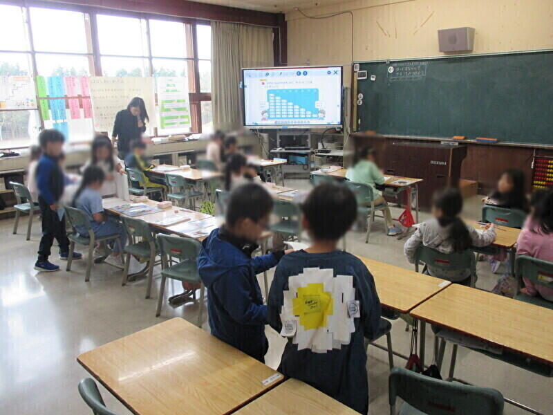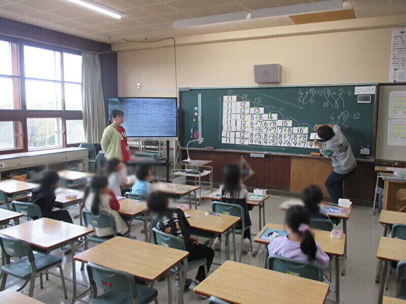 1年生は、算数の学習をしていました。計算カードを見て、数の関係について気づいたことを発表し合っていました。