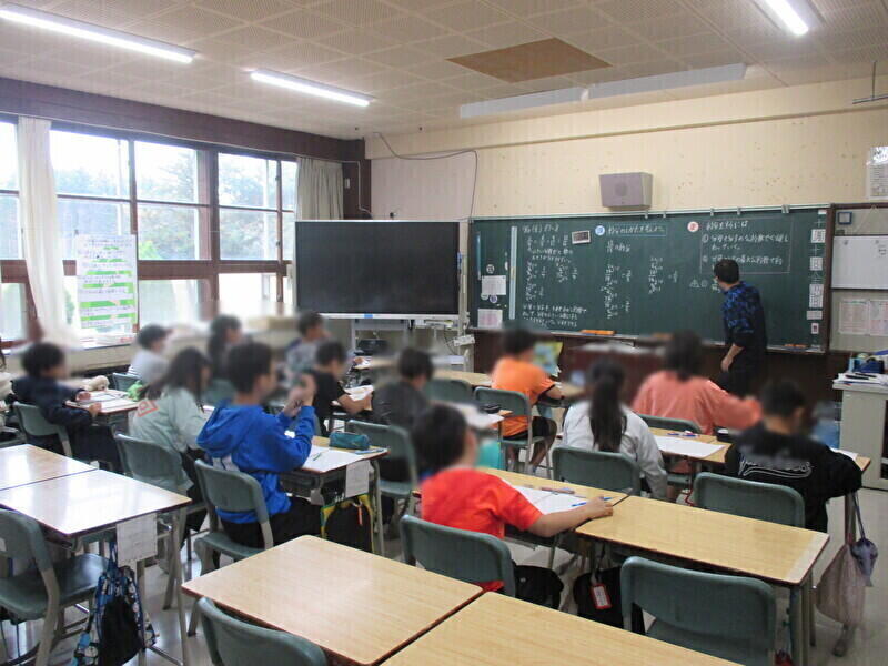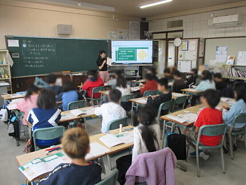 4年生は、算数と国語の学習をしていました。算数の学習をしていた学級は、ドットの数の求め方を工夫して、1つの式で表す方法について、どんなやり方があるか、考えていました。