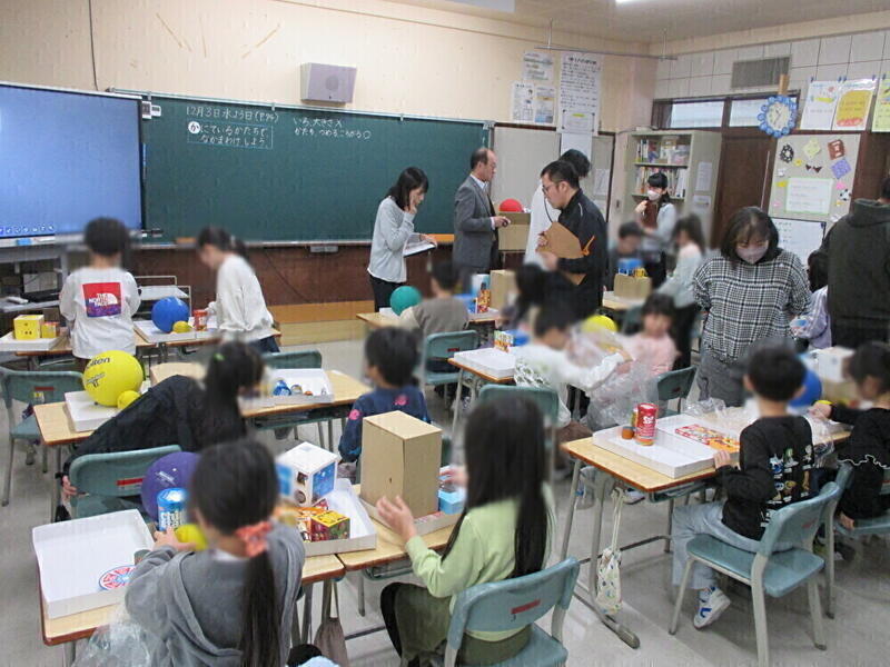 1年生は、算数の図形の学習で、似ている形で仲間分けをする学習でした。2人でペアになり、相談しながらいろいろな形を仲間分けをしていました。子どもたちは、仲間分けした根拠を「ふつうの四角と真四角(に分けられる)」、「縦だと転がらないけれど、横だと転がる形(円柱)」、「(円柱は)横から見たら長四角だけど、ボールはどこから見ても丸い」などと話しながら学習していました。