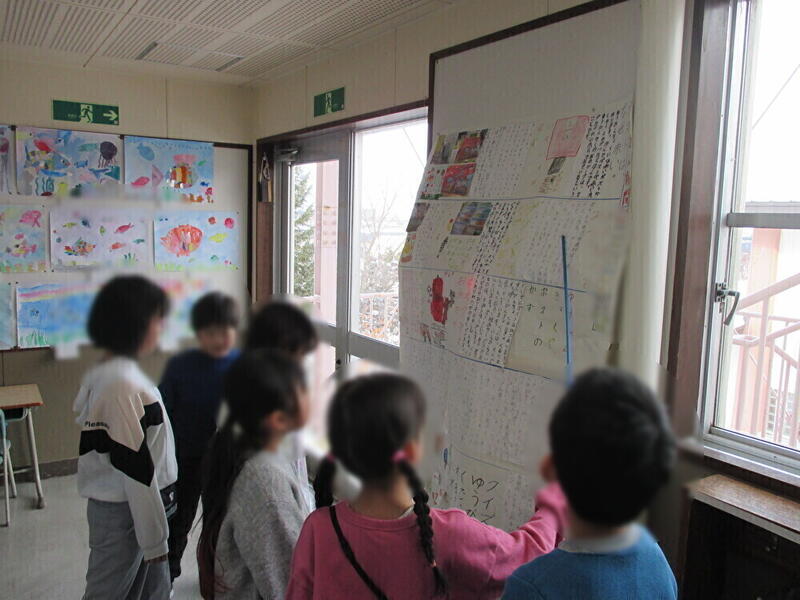 2年生は、国語の学習をしていました。冬休み前に、郵便局、コンビニエンスストア、児童館に調べ学習に行きました。今日は、その学習で分かった事などをまとめた新聞などを使って発表する練習をしていました。グループ内で役割分担をしながら発表の練習をしていました。