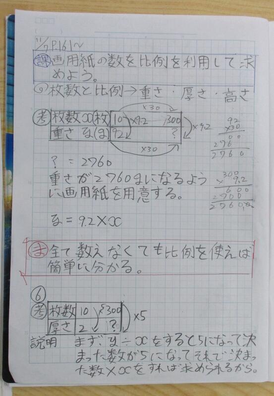 今日の学習は、「比例の利用」でした。しかも、教科書に「今日の深い学び」と記された、深い学びの実現を求められたページでした。問題文には、画用紙「300枚を用意する方法を考え、自分の考えを表や式を使ってかきましょう」と書かれており、ただ単に答えを求めるのではなく、「表や式」を使って考えるように求められていました。