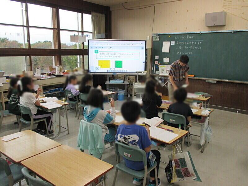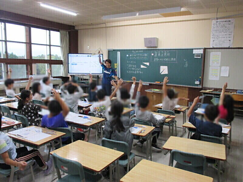 2年生は、算数の学習をしていました。正方形や長方形に一方の対角線を引き、そこで切ったら、どんな形になるか、折り紙を実際に切って確かめていました。ぴったりと重なる2つ三角形に分けられ、その三角形は、直角三角形であることも理解していました。3枚目の2年生の画像は、片腕を上に伸ばし、もう片方の腕は横に伸ばし、身体で「直角」を表しているところです。