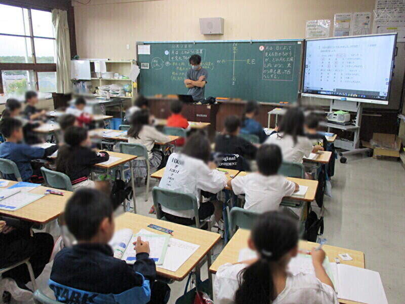 理科の学習をしている学級は、月の位置の変化について学習していました。この学習のまとめの時間で、月の見え方(満月、半月、三日月など)や、動きについて、まとめていました。