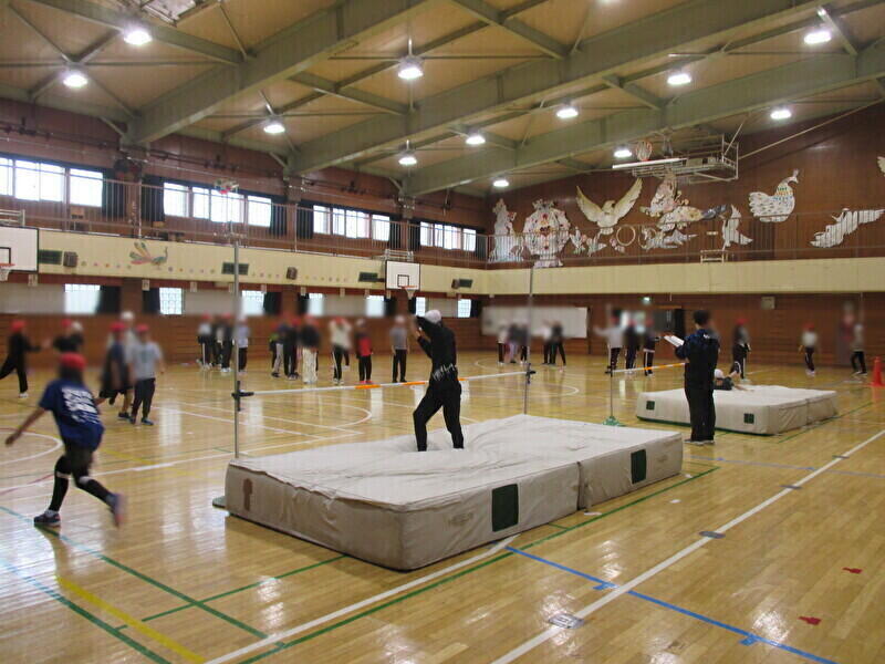 5年生は、体育の学習をしていました。走り高跳びをしていました。踏み切る脚がどちらの脚になるか、身体をどちら向きにしたら跳びやすいか、考えながら練習をしていました。