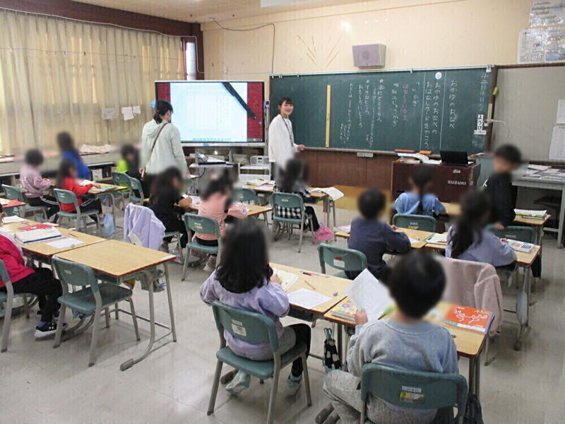 1年生は、国語の学習をしていました。昔話を紹介する「おはなしカード」を書いていました。まず今日は、教科書に載っている「おかゆのおなべ」について、「おはなしカード」を書きました。次回の学習で、自分の選んだ昔話で「あはなしカード」を書きます。
