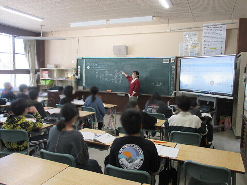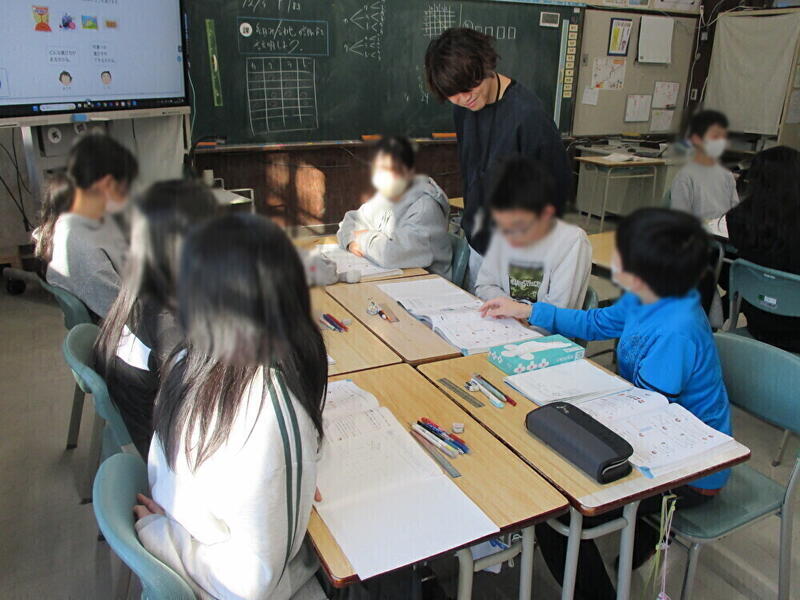 6年生は、算数の学習をしていました。確率の学習で、4つのお菓子から、違う種類の3つを選ぶ「組み合わせ方」について、何通りあるか、考えていました。今まで学習した表や樹形図を使って考えたり、グループで自分たちの考えを発表し合ったりして考えをまとめていました。グループの学習では、1人の考えに次々に別の子が考えを補足しながら考えをまとめていき、「つまり、4種類の中から、1種類を選ばないことと同じじゃない。」と考えがまとまっていました。