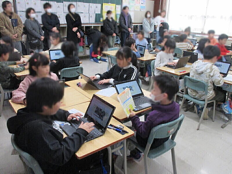 3年生は、社会の学習でした。交通事故の写真を見て気づいたことをグループごとのシートに自分たちの気づきを書いていました。これまでは、タッチペンを使って文字入力もOKでしたが、今回は、キーボートを使ってローマ字入力のみで、自分の考えを書いていました。