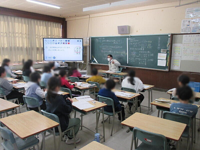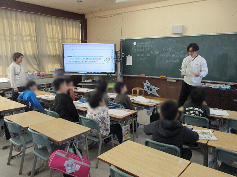 3年生は、算数の学習をしていました。3年生は、1、2時間目にスケート学習があったのですが、全く疲れを見せず、3時間目の学習に集中していました。立派です。3年生は、(2けた)×(2けた)のかけ算の計算の仕方について、考えていました。