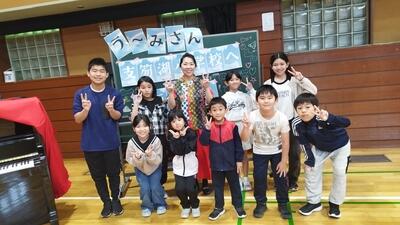 【学校の前来ました。5・6年生がポーズを決めています。そういえば、6年生は、あと半年で中学校へ進学するのですね。小学校生活の思い出たくさんつくってください。】
