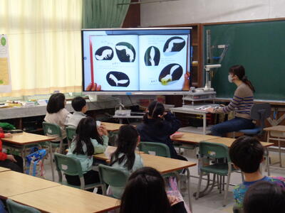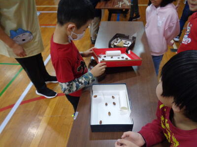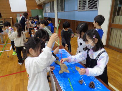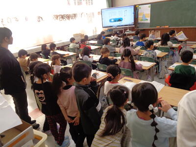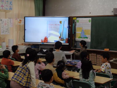 ひまわり園の年長さんが歩いて本校へ来校しました。1年生と交流し、校舎や授業の様子を見学しました。