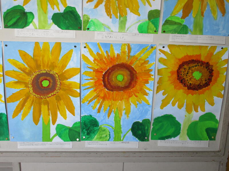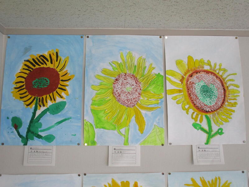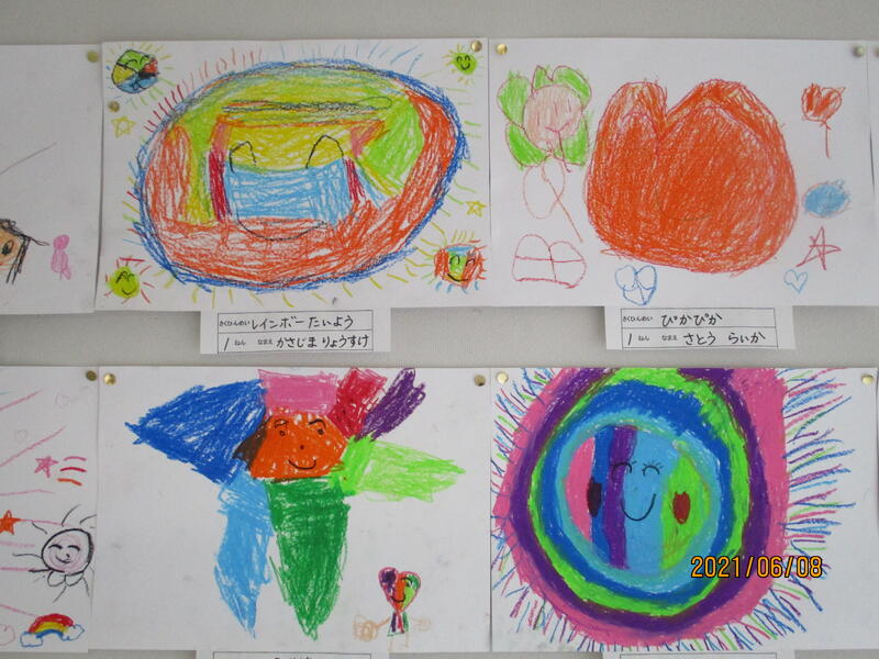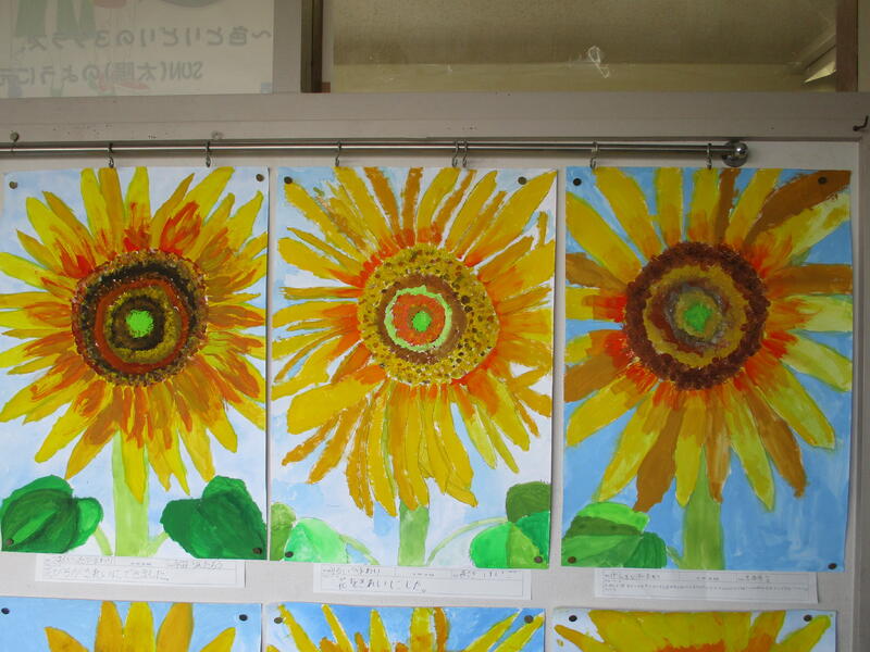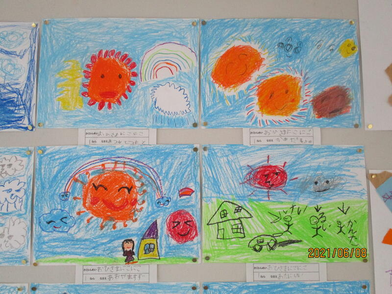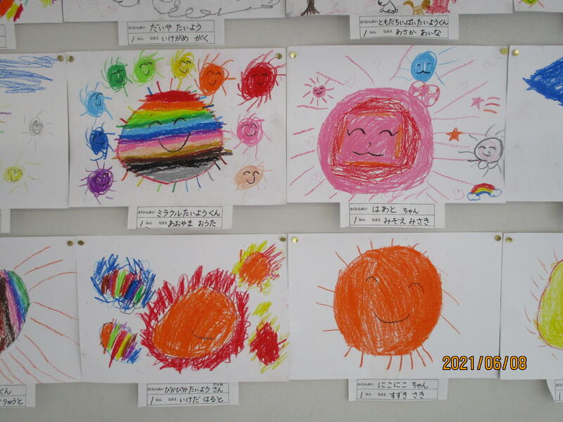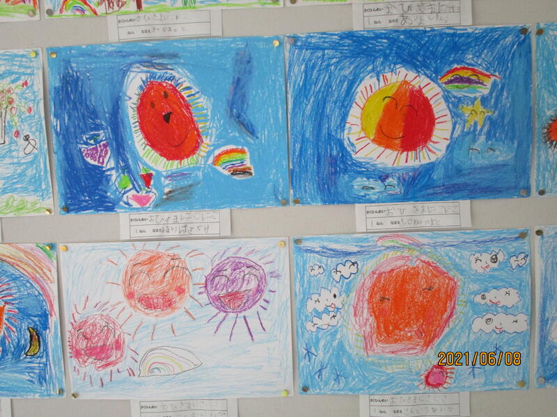 気温があがってきました。もうすぐ夏がやっていきます。1年生はクレヨンでお日さまの絵をかきました。陽気にあふれる作品を紹介します。