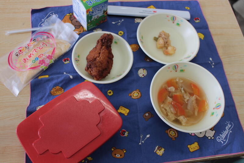 1年生は今日から給食開始です。メニューはごはん、ポークカレー、温州みかんゼリー、牛乳でした。うれしそうに、おいしそうに食べていました。