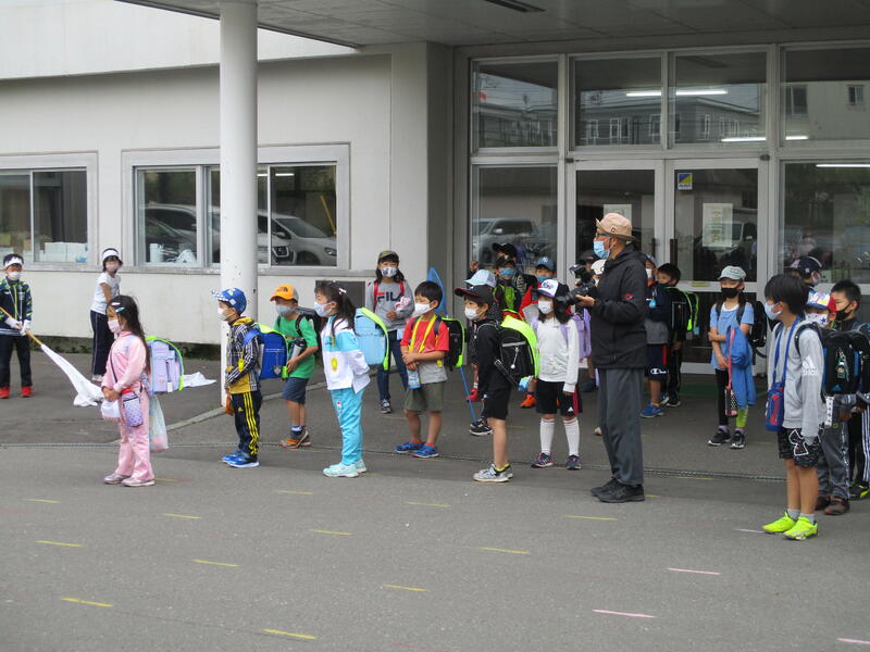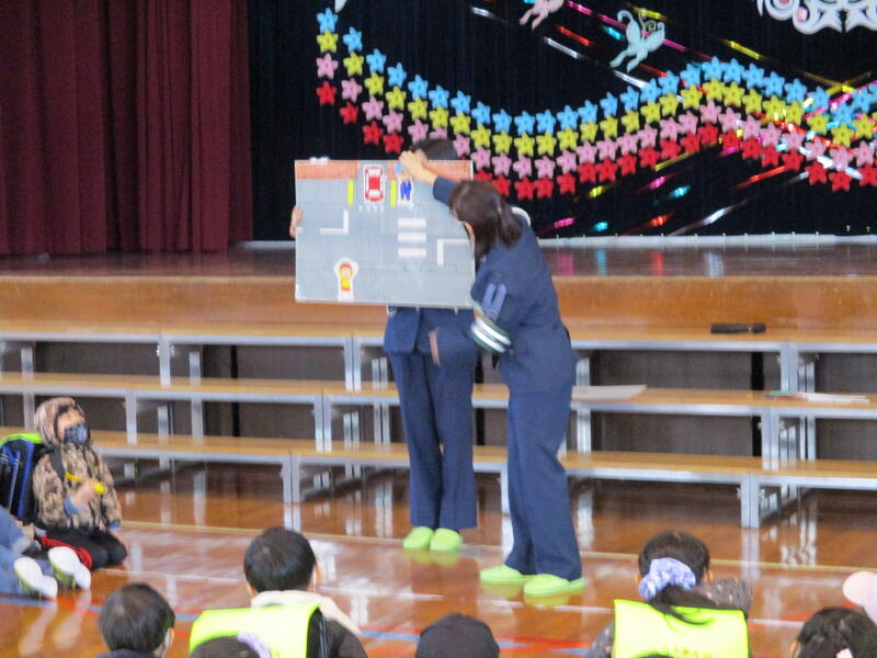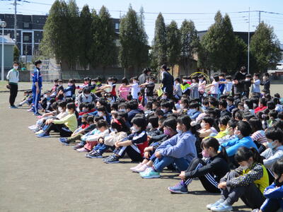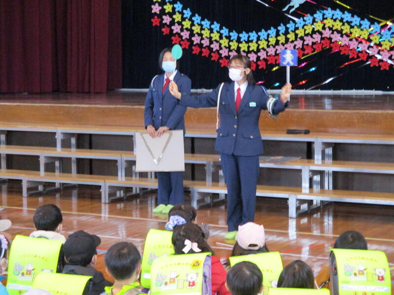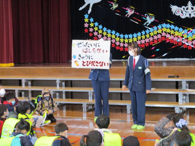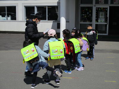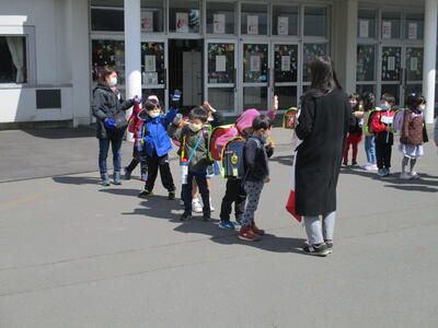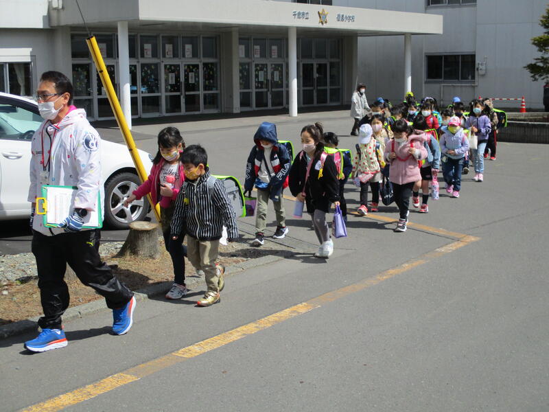 今日は初めての下校でした。交通安全指導員さんに交通安全についてお話ししていただきました。しばらくは、担任や担任外の教員が付き添って下校します。ご家庭でも交通安全について話題にしたり、毎日「今日はどこへ帰るのか」の確認をお願いします。