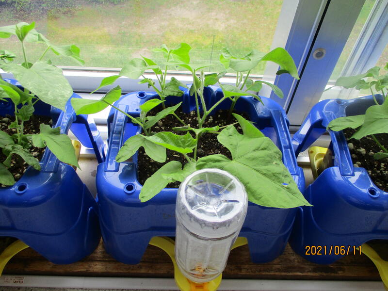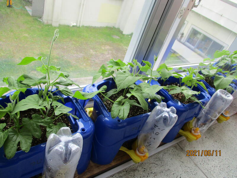 1年生の教室で育てているあさがおの芽が、日に日に大きくなってきました。子どもたちは生長の様子を記録しています。