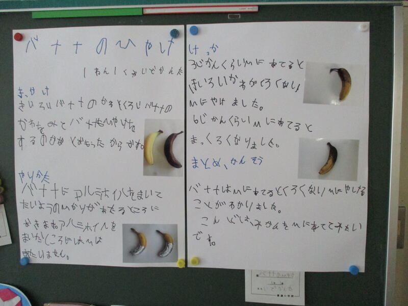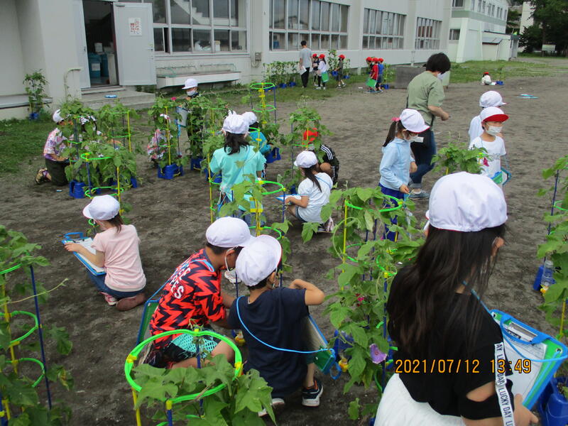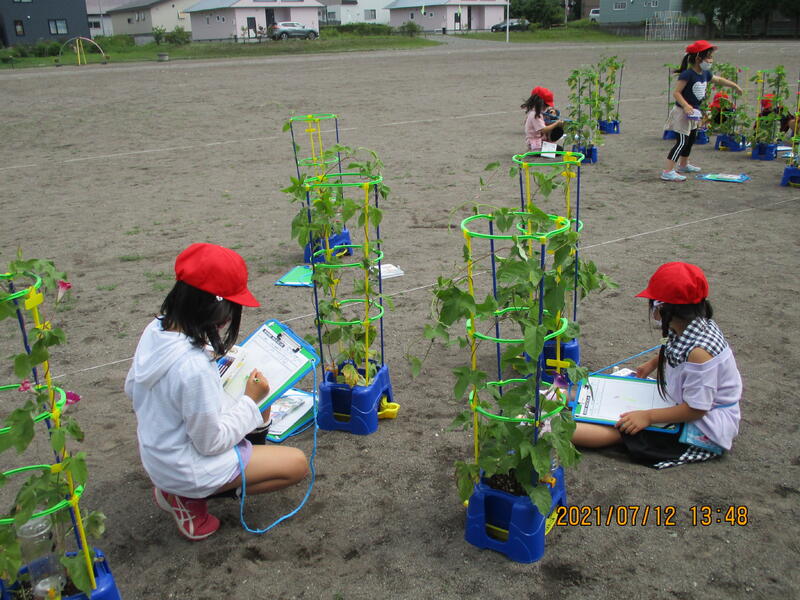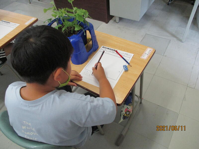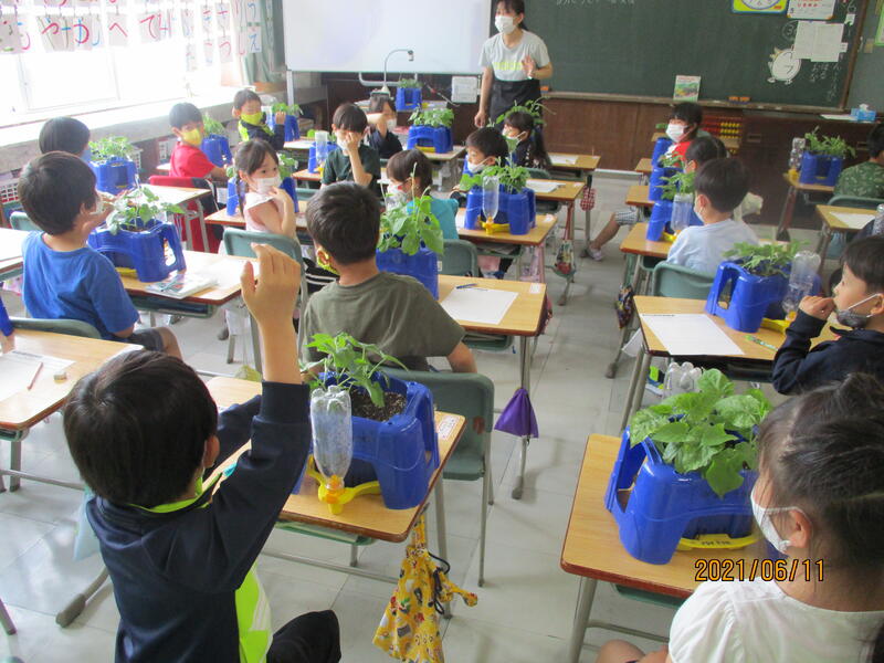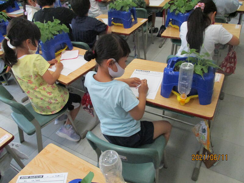 夏に向けて、あさがおもぐんぐん育ってきました。1年生は、葉の数や色の変化、手触りなどについて発表し、気づいたことをカードに記録していました。