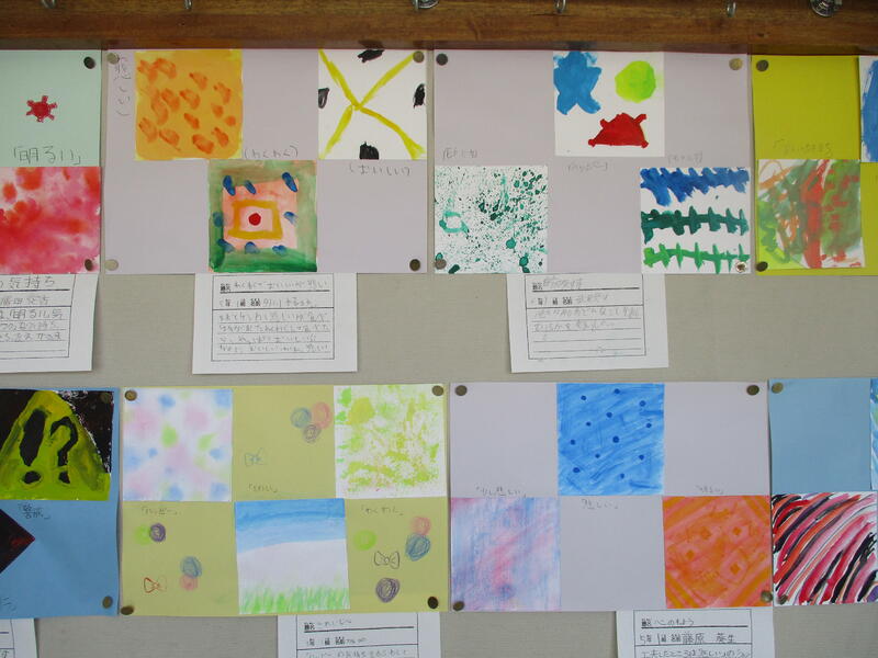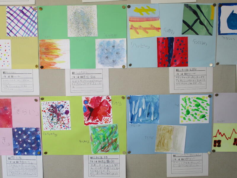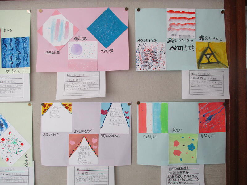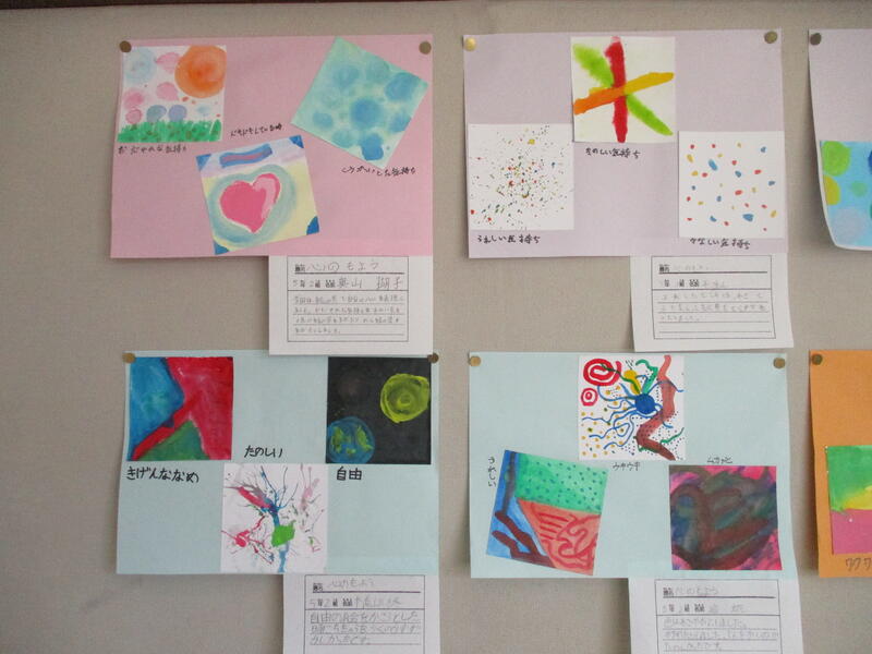 5年生が絵の具を使っていろいろな表現技法を駆使して、「心のもよう」を表しました。教室前に掲示されている作品を紹介します。
