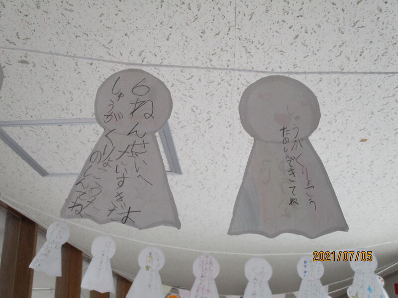 1年生から6年生へてるてる坊主のメッセージカードが届きました。4月からお世話になっていることへの感謝や、「修学旅行、気をつけて行ってきてね」という気持ちが記されていました。