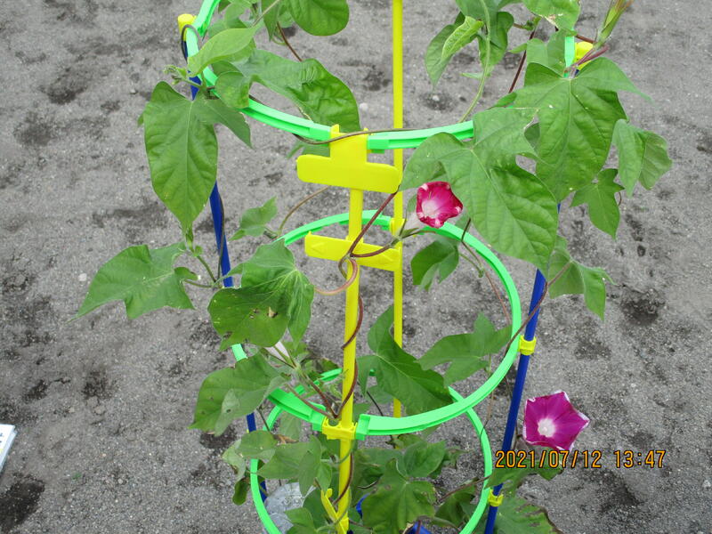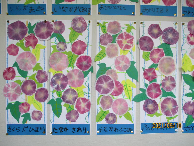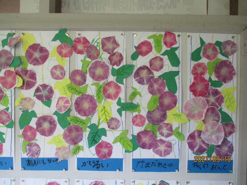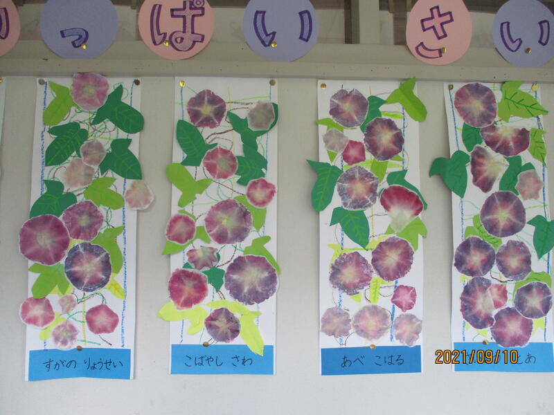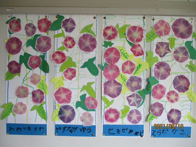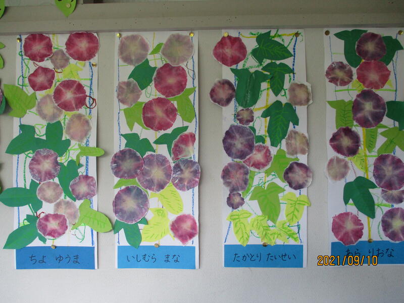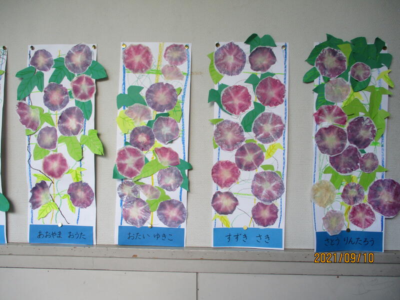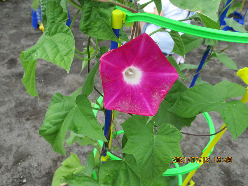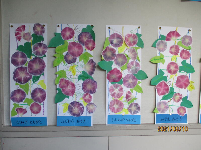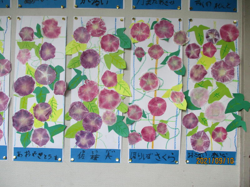 1年生が育てていたあさがおに、花が咲き始めました。「ぼくのは2つ咲いていた」「私のは3つ、むらさきの花だった」と子どもたちは大喜びです。夏休み中もきれいな花がさくことでしょう。