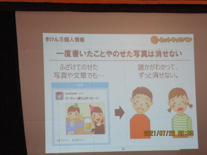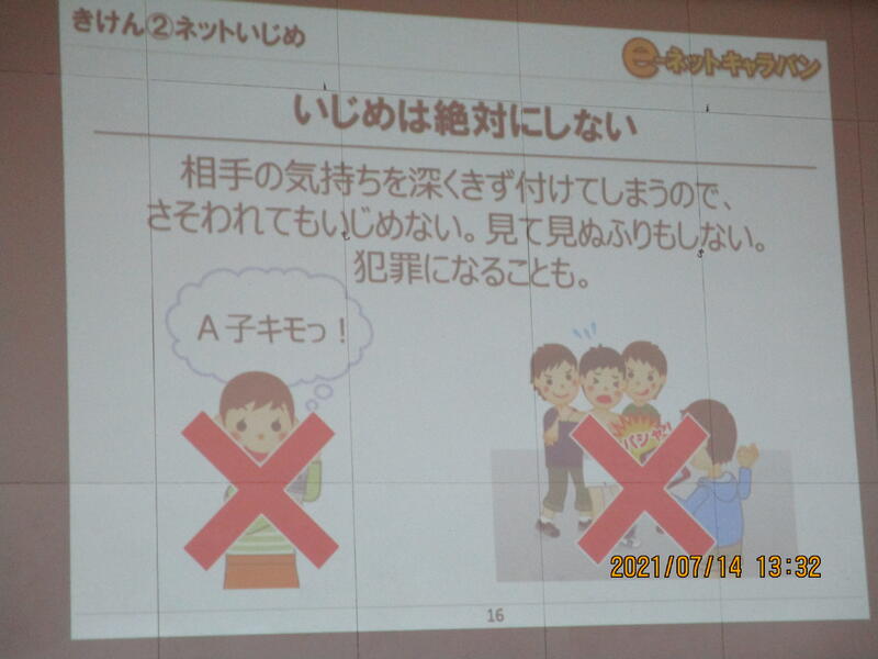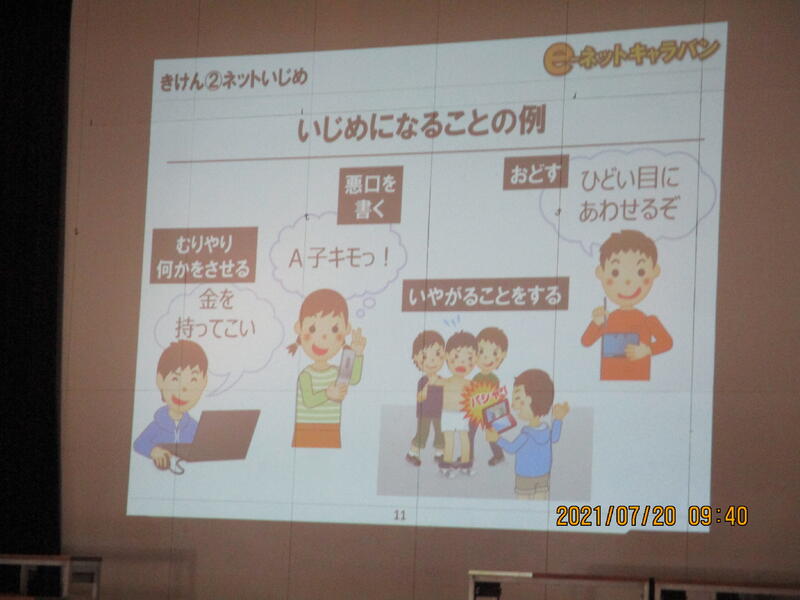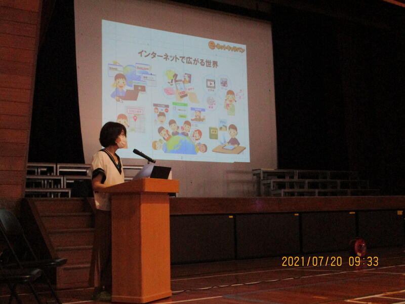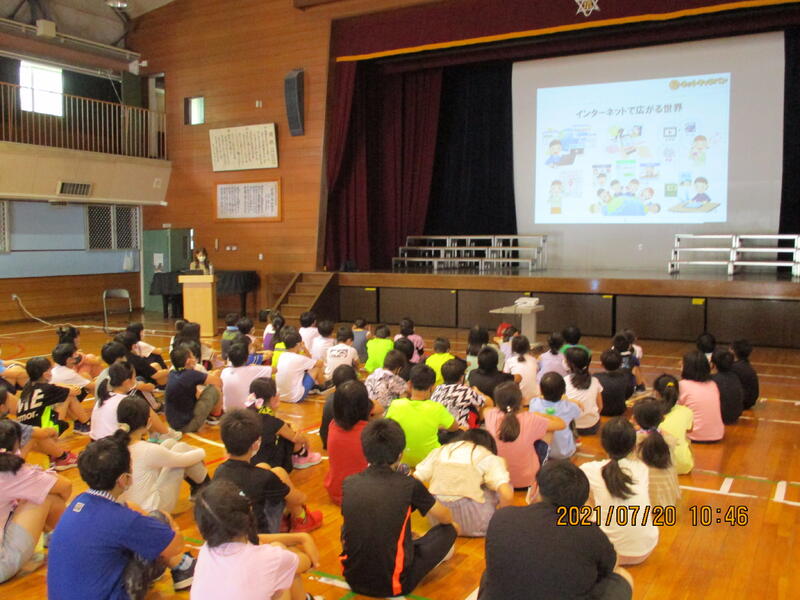 本日、「一般財団法人マルチメディア振興センター」の講師の方をお招きし、6年生を対象に「ネット安心講座」を実施しました。夏休みに入ると子どもたちも、インターネットを利用する機会も多くなると思います。ご家庭におかれましては、ご家族で利用時間や用途などのルールづくり、お子様の端末の利用状況の把握等をお願いいたします。