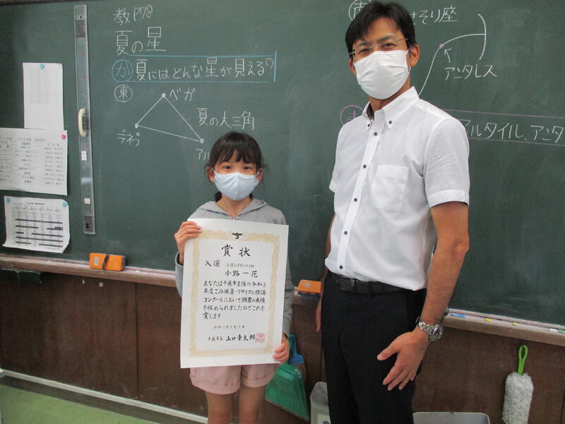 4年生では、毎年、千歳市主催の「ごみ減量・リサイクル標語コンクール」への標語づくりに取り組んでいます。今年度は市内全体で800点以上の応募があった中、本校4年1組の小路一花さんの作品が入選しました。