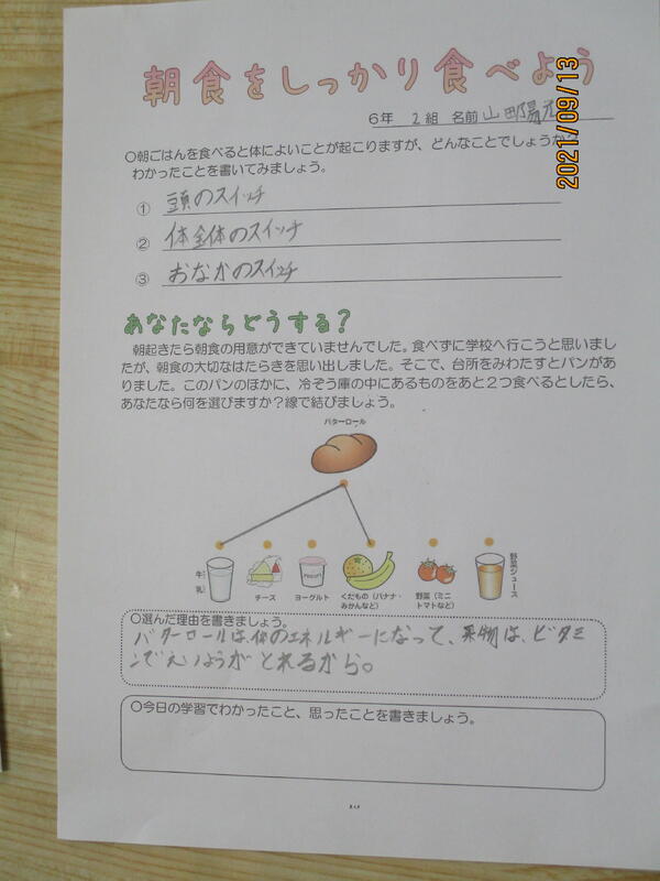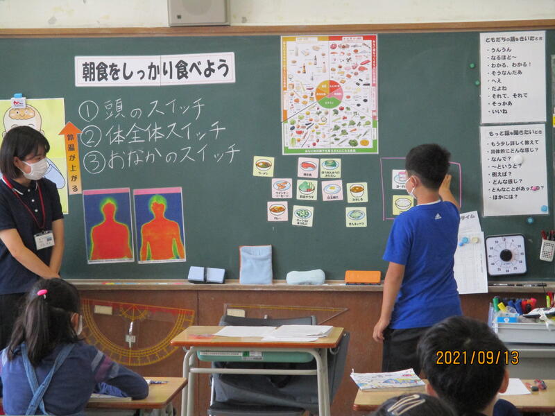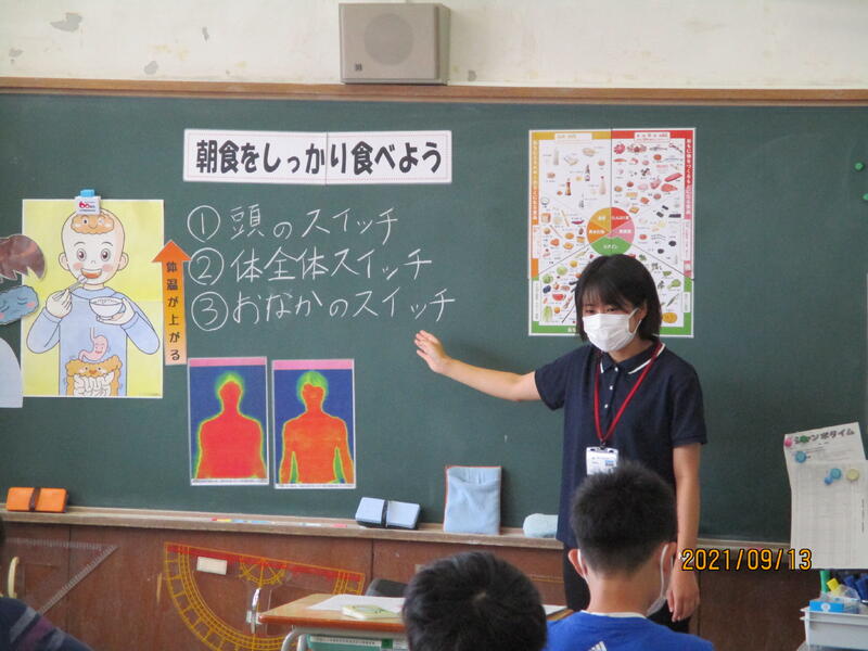 栄養教諭の吉田先生が、6年生に「食の指導」を行いました。1日の活力のもとになる「朝食」について学習をしました。伸び盛りの6年生、うなずきながら朝食の大切さを学びとっていました。