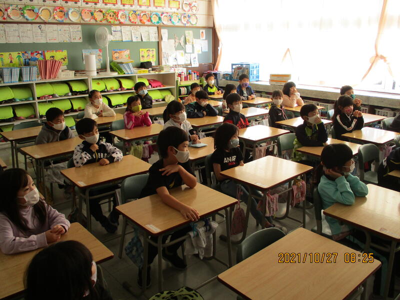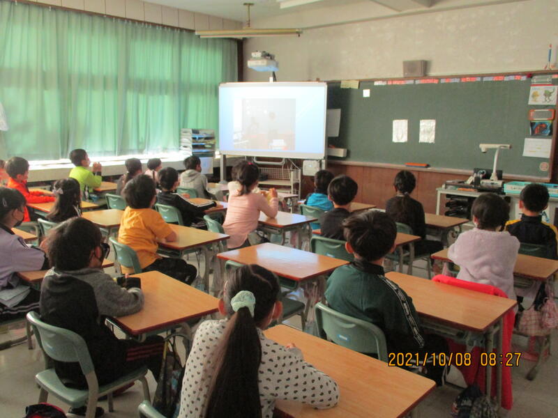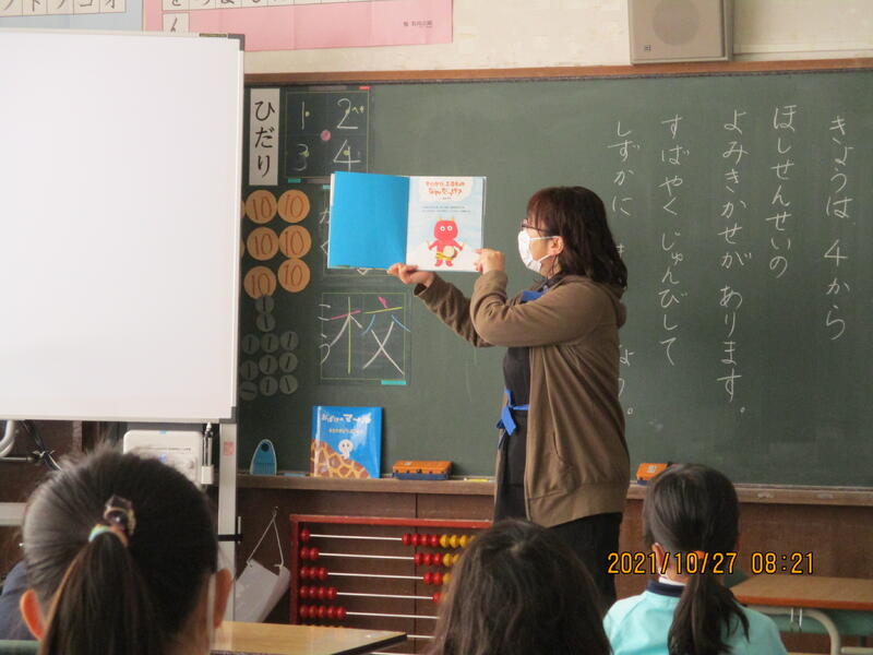 「読書の秋」を迎え、図書司書の星さんによる「朝の読み聞かせ」がはじまりました。今日は1年2組で「そらからふるもの なんだっけ」という本を読んでもらいました。子どもたちは本の世界にどんどん引き込まれ、眼を輝かせてお話しに聞き入っていました。