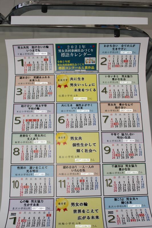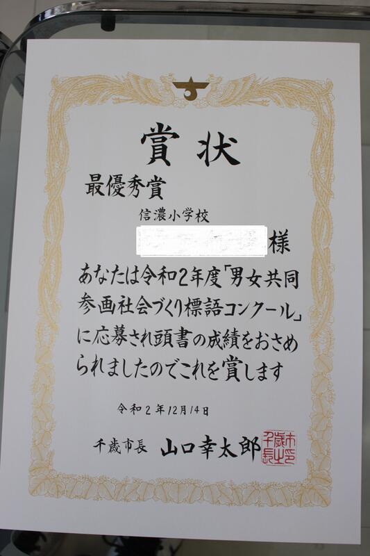千歳市「男女共同参画社会づくり標語コンクール」において、本校6年生児童1名が最優秀賞に選ばれました。(最優秀賞1、優秀賞2、入選14)