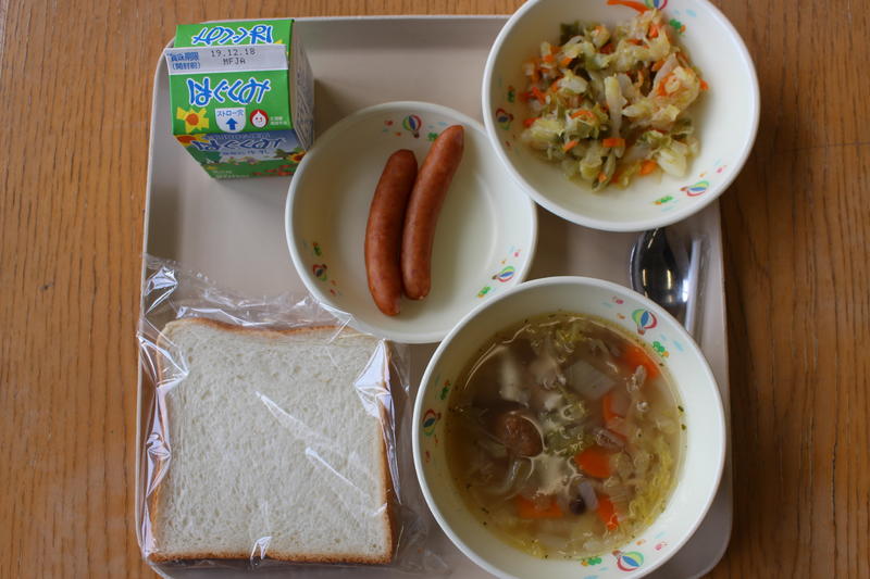 ・かくしょくパン ・ミートボールスープ ・ウインナー ・やさいソテー