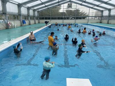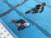 水難事故等にも備えて着衣水泳を行いました。ペットボトルを利用して浮く感覚も試しました。