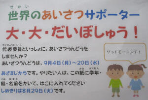 学校生活では、今週より児童会による「世界のあいさつ」(あいさつ運動)がスタートしています。