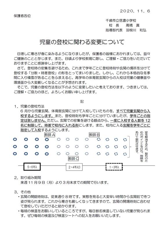 今まで高学年は、体育館玄関から登校していましたが、児童玄関からの登校に変更となります。