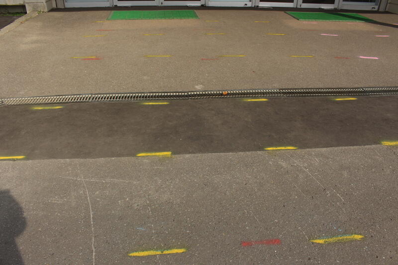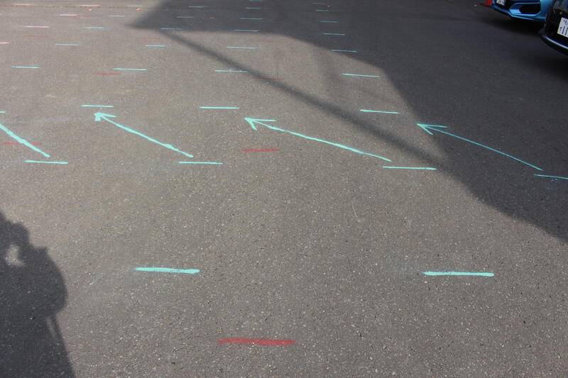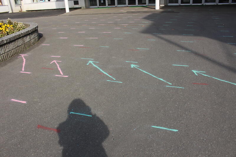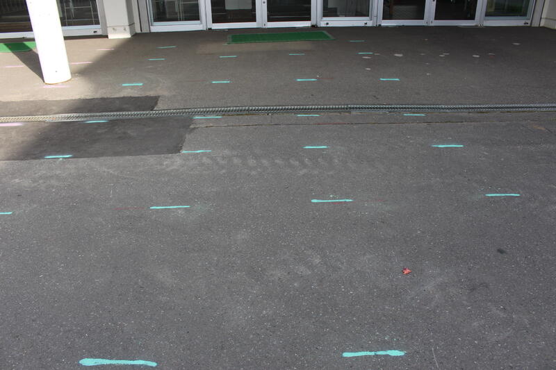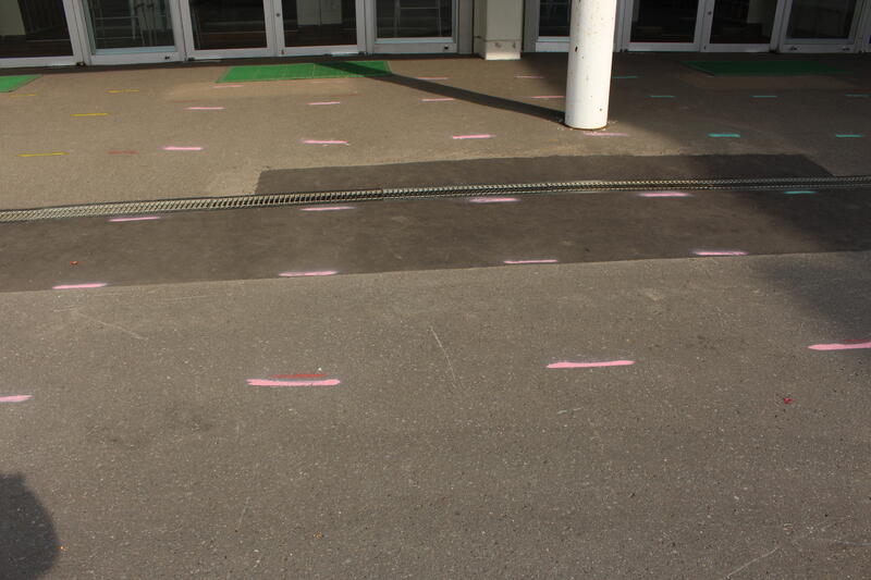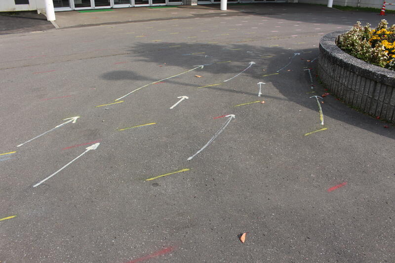 学年ごとに並ぶ場所が決まっています。3色の印がありますので、順番を守って並びます。