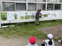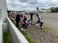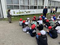 今年も3年生で地域の方のサポートいただきまして、3年生で大豆づくりをはじめました。今日は、これからの大豆づくりの流れを確認して。種をまいて、ネットをはりました。