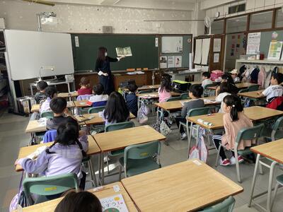 朝の時間、図書館司書による読み聞かせです。