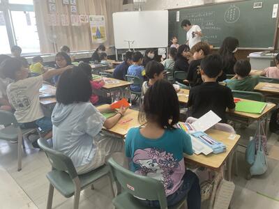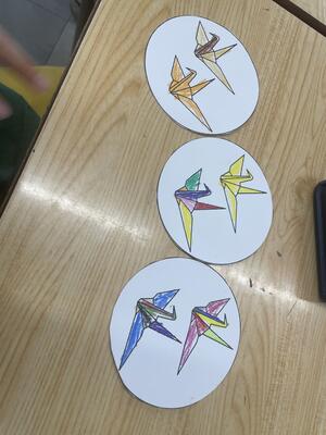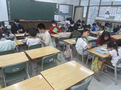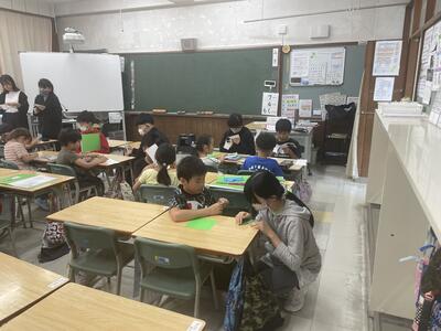 平和集会に向けて6年生が1年生教室にきてくれて、鶴の色塗りなどをサポートしてくれました。