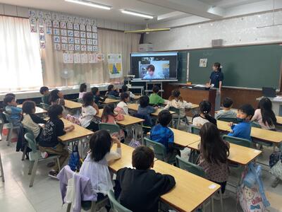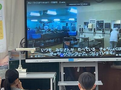1年生学級で、栄養教諭による食育の授業でした。給食がどのようにできるのかを学習しました。